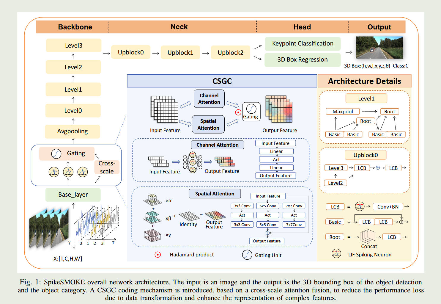 为了解决上述痛点,作者提出了 SpikeSMOKE 架构,这是一种基于经典单阶段无锚框模型(SMOKE)改造而来的全脉冲化网络:
