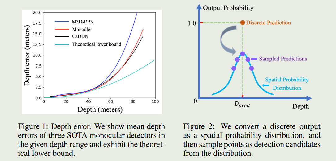 这篇论文提出将单目3D检测的输出形式从“单一且固定的离散3D边界框”重新构建为“基于深度的连续空间概率分布”。它解决了一张2D图像向3D推理时由于“维度鸿沟(Dimension Gap)”带来的深度估计极度不确定的问题。通过这种不确定性建模与沿深度的多次采样,在不改变原有网络架构的前提下,使得 12 个当时的 SOTA 模型在 KITTI 数据集上的 Average Precision (AP) 获得了约 20% 的惊人相对提升。