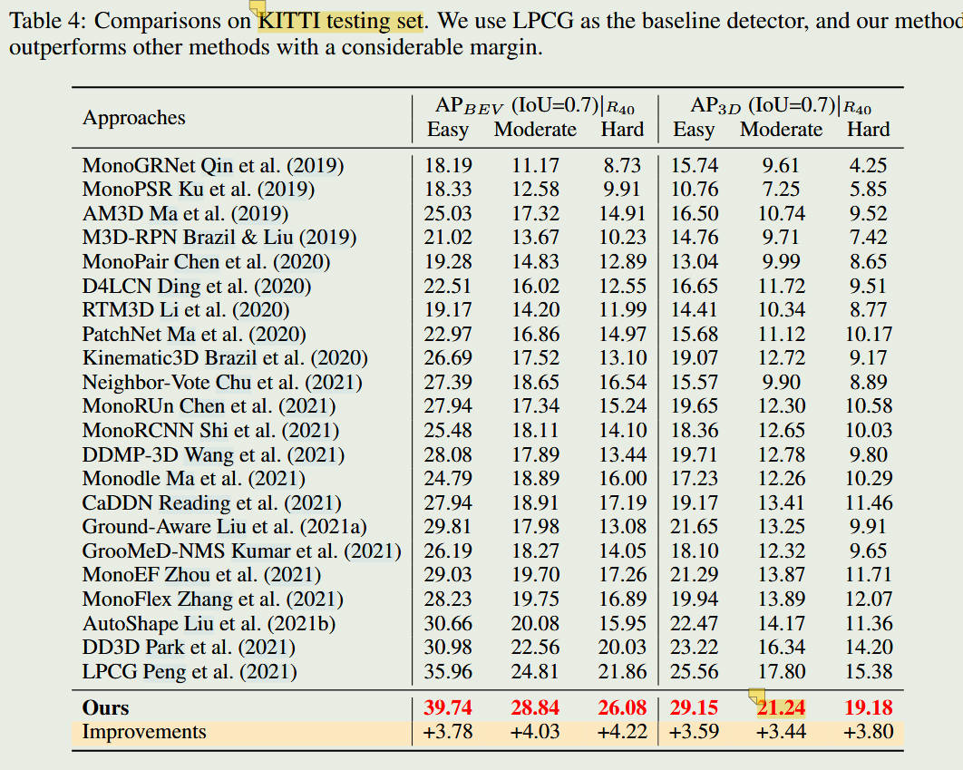 效果极度显著。作者将这一输出表示方法作为“即插即用”的模块套用在 12 个单目3D探测器上,在推理耗时增加极小的情况下,使得它们的平均精度(AP)持续且稳定地获得了约 20% 的相对提升。