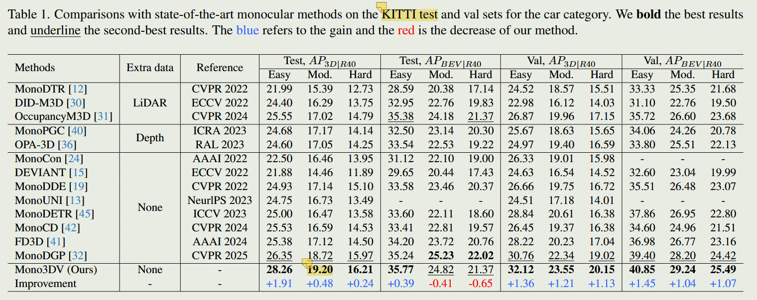 性能突破: 在权威的 KITTI 3D 目标检测基准测试中,Mono3DV 在不依赖任何外部数据或预训练大模型的情况下,在 Car 类别上实现了当时最先进(State-of-the-Art)的性能。