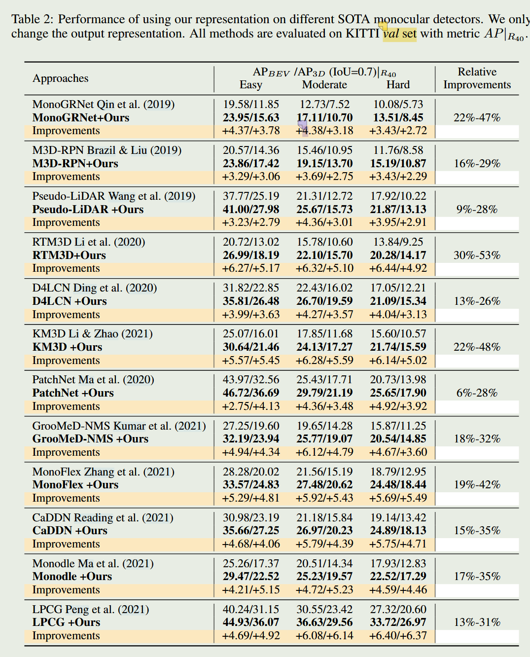 效果极度显著。作者将这一输出表示方法作为“即插即用”的模块套用在 12 个单目3D探测器上,在推理耗时增加极小的情况下,使得它们的平均精度(AP)持续且稳定地获得了约 20% 的相对提升。
