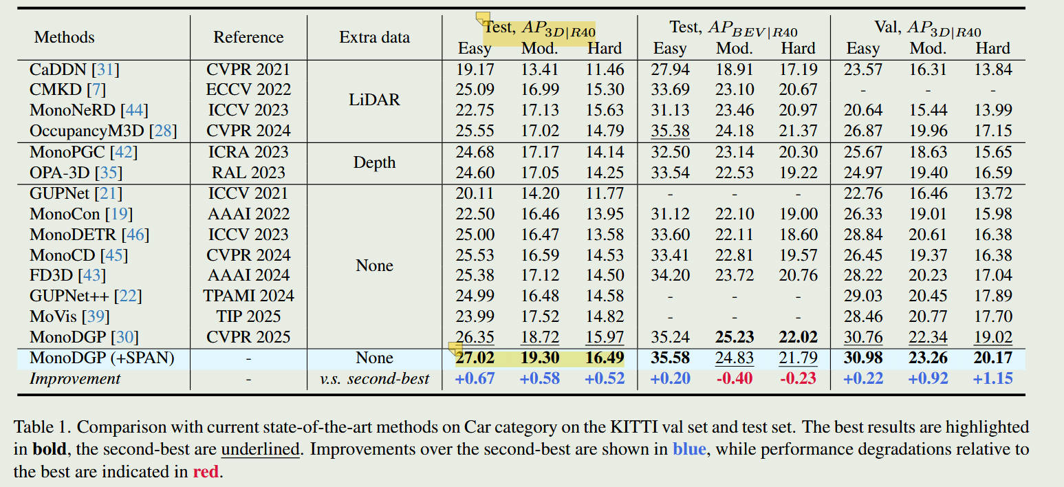 显著提升: 实验证明,将 SPAN 集成到现有的 SOTA(先进)单目检测模型中,无需在推理阶段增加任何额外模块或计算开销,即可大幅提升 AP(平均精度)。