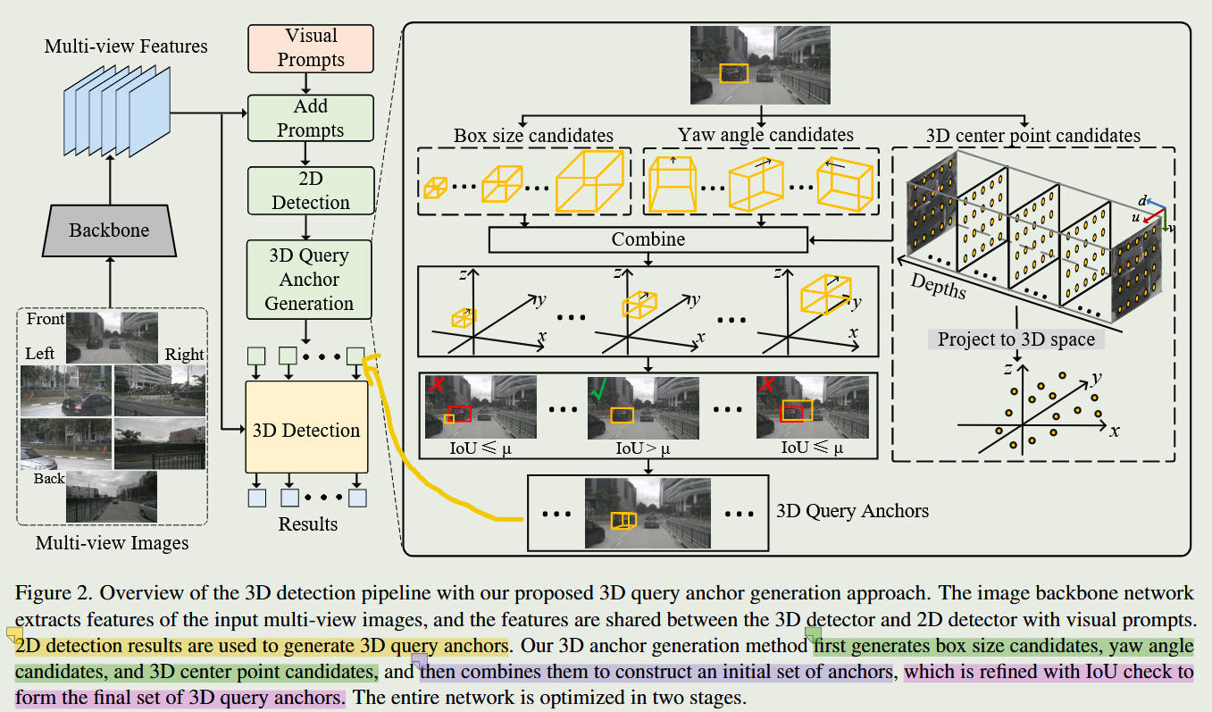 这套即插即用的机制将 2D 框“升维”成高质量 3D Query 的过程分为三大步: