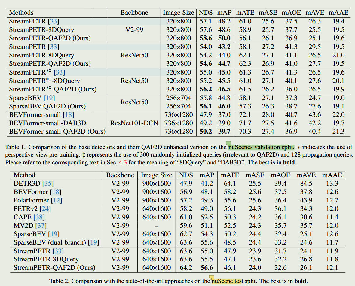 全面一致的提升: 作者将 QAF2D 框架作为插件,无缝接入了 StreamPETR、BEVFormer-small 等主流模型。在权威的 nuScenes 数据集中,它带来了非常显著的性能跃升(例如最高提升了 2.3% 的 NDS 和 2.7% 的 mAP)。